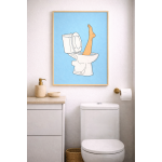 This wall art features a stark illustration of a toilet with a single leg emerging upward, frozen mid-moment. Clean lines, flat colors, and a soft blue background make the scene visually calm while the subject matter does the opposite.