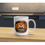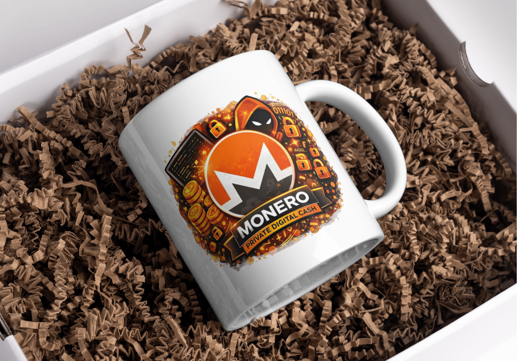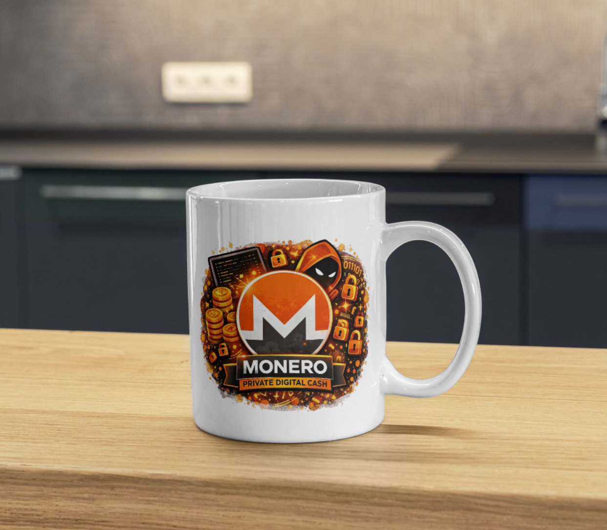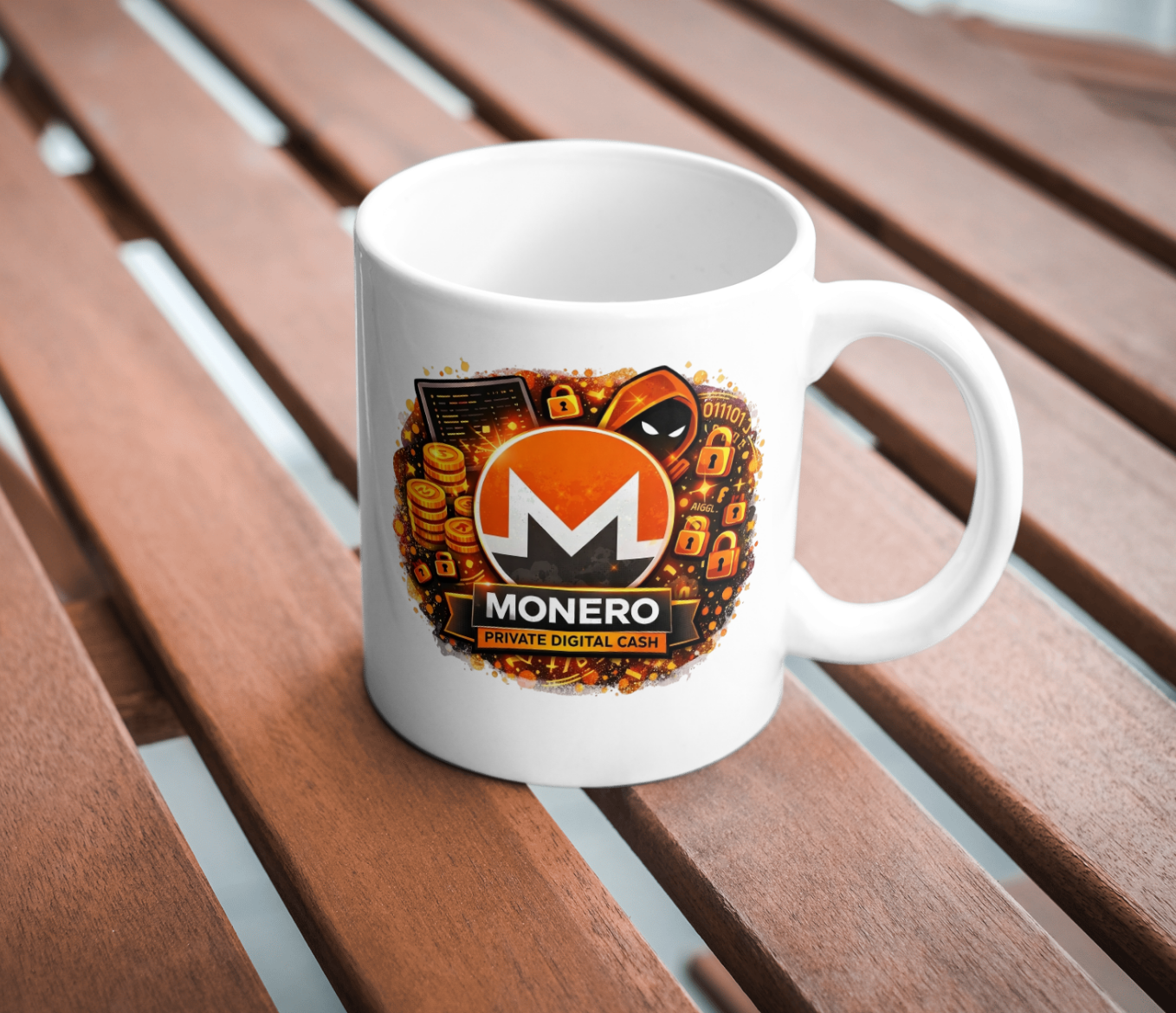 A bold ceramic coffee mug celebrating Monero with a privacy-focused digital cash design.
