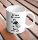 Time is finite. Money is renewable. The “Money Returns, Time Does Not” mug pairs a vintage-style tycoon illustration with an hourglass motif to remind you that your most valuable asset isn’t cash — it’s time.