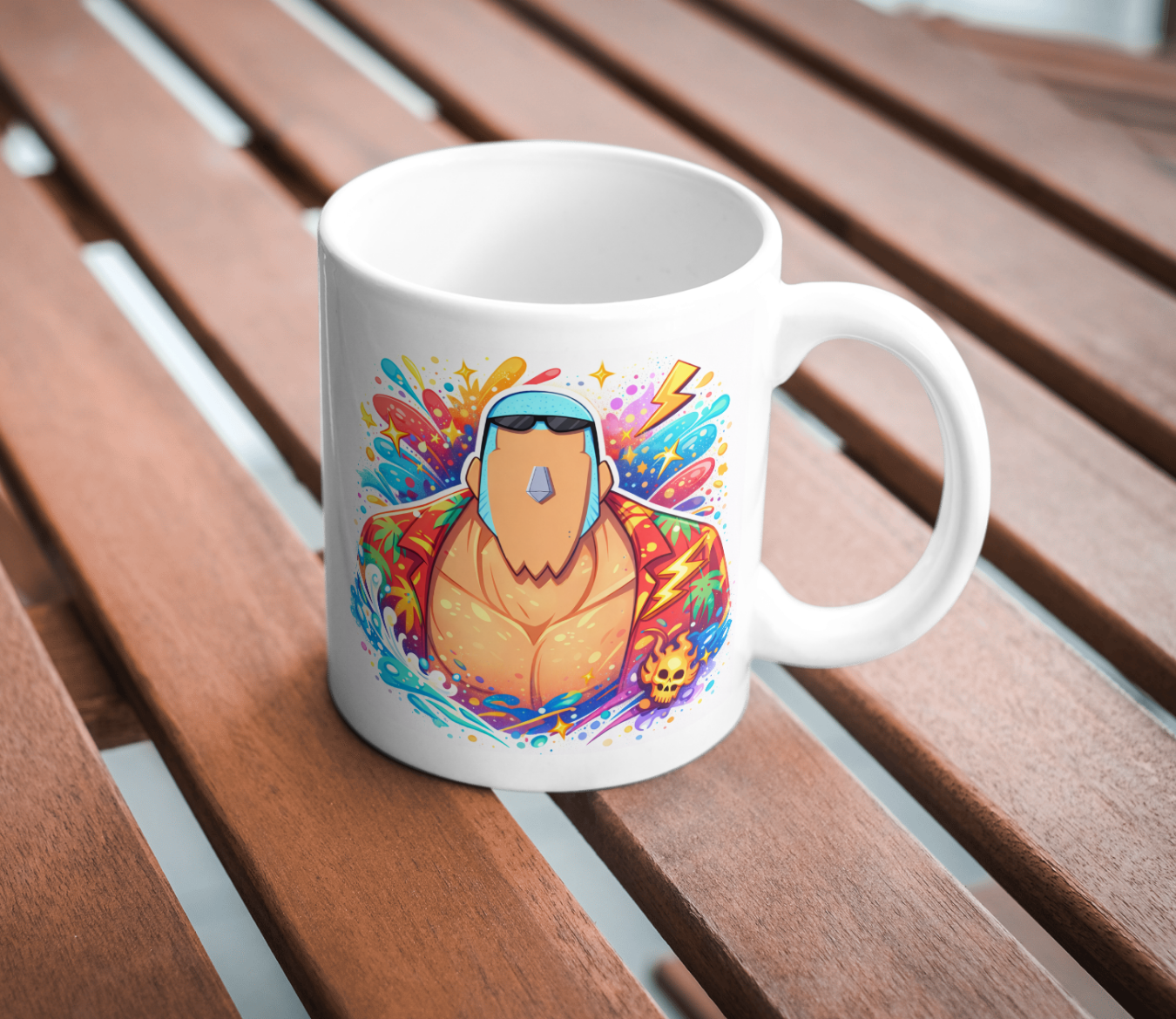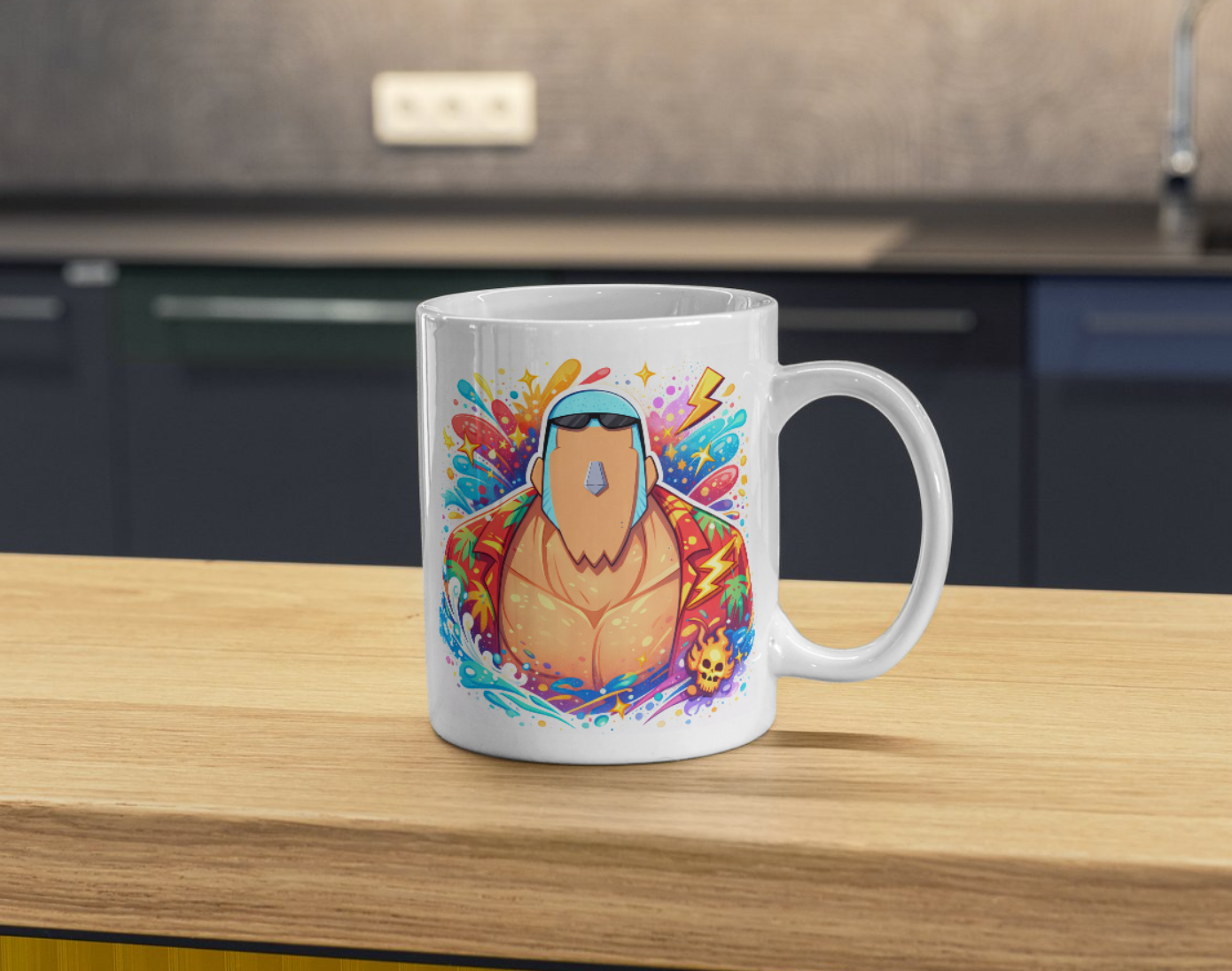A powerful ceramic coffee mug featuring a muscular anime warrior in vibrant tropical splash art.