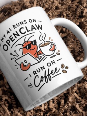 This design captures the daily reality of modern tech life with humor and style. A confident crab wearing sunglasses works on a laptop while holding a steaming cup of coffee, under the bold statement “My AI Runs on OpenClaw – I Run on Coffee.” It’s a clever visual metaphor for developers and AI builders who power intelligent systems while running purely on caffeine and determination.