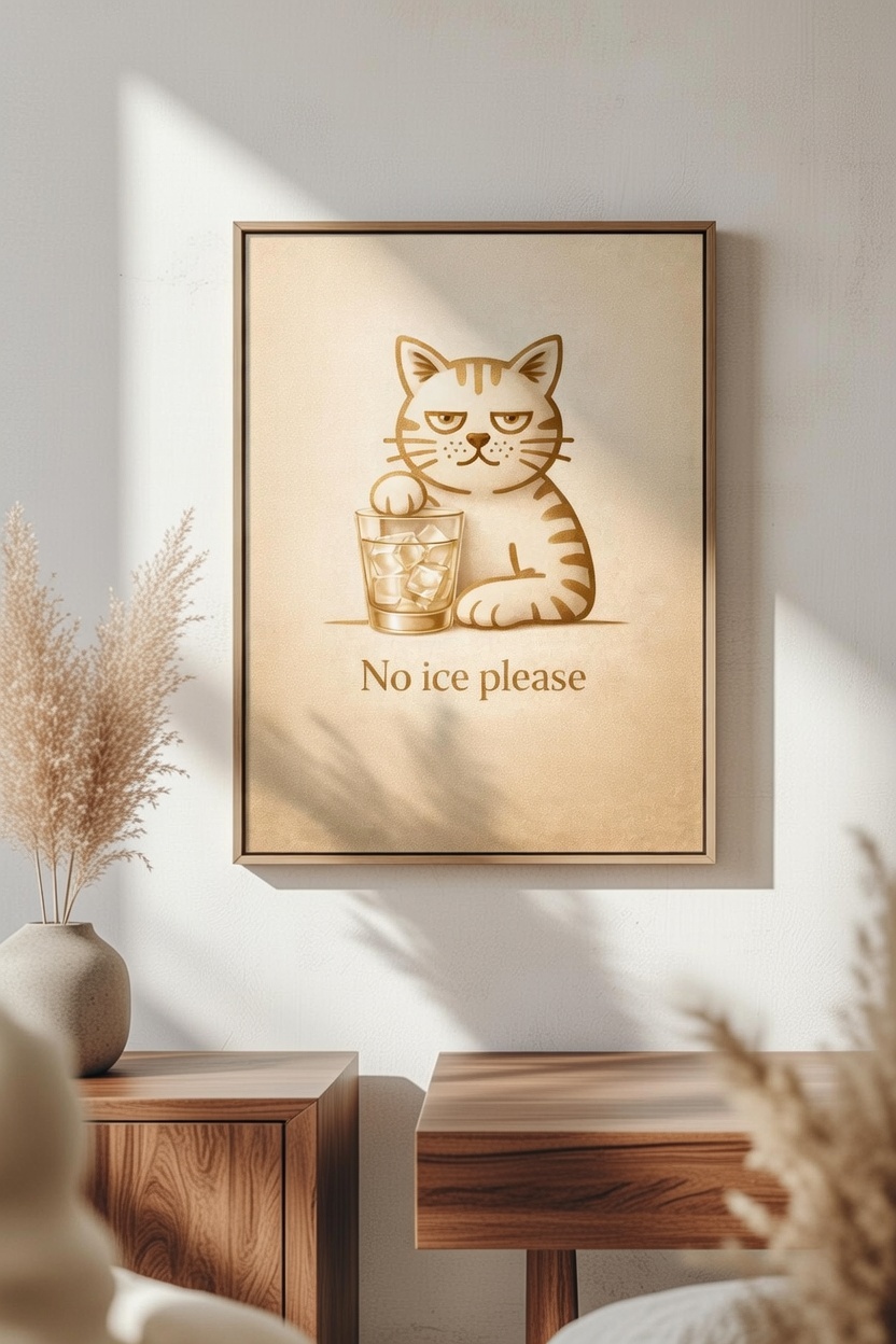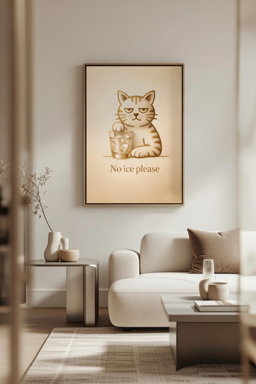 This minimalist illustration features an unimpressed cat resting its paw on a glass of ice, paired with the understated phrase “No ice please.” The warm monochrome palette and restrained linework elevate humor into quiet design, balancing irony with calm visual harmony.