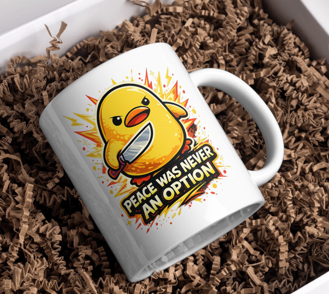 Explosive cartoon mug featuring an angry yellow chick holding a knife with the phrase “Peace Was Never an Option.”