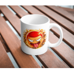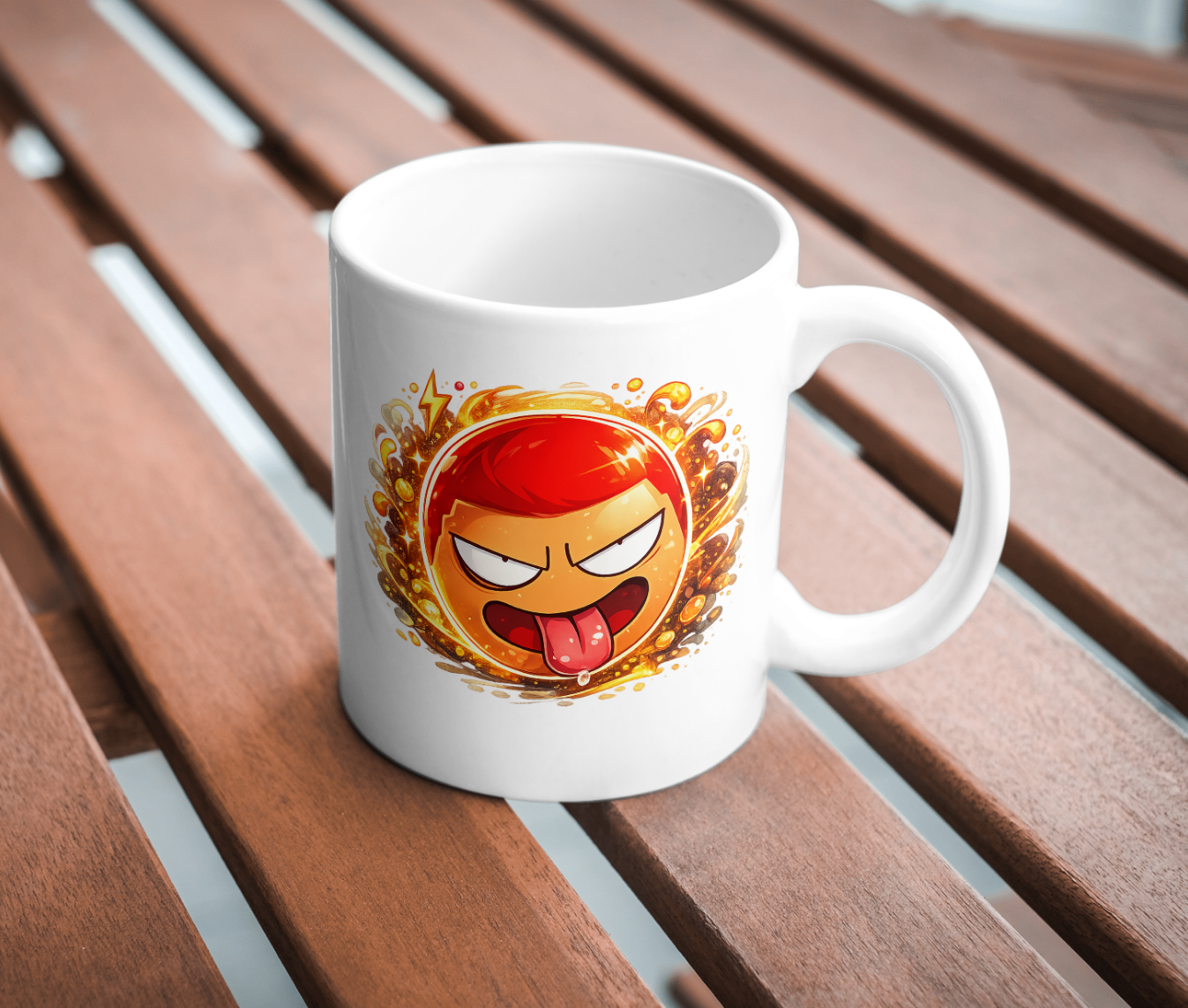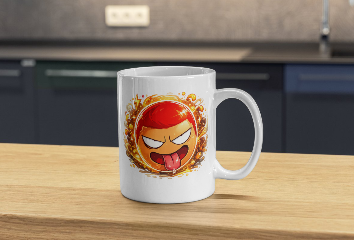 This energetic mug showcases a mischievous anime-inspired emoji character exploding with fire, sparks, and bold motion. Designed to add humor, attitude, and energy to your daily coffee ritual.