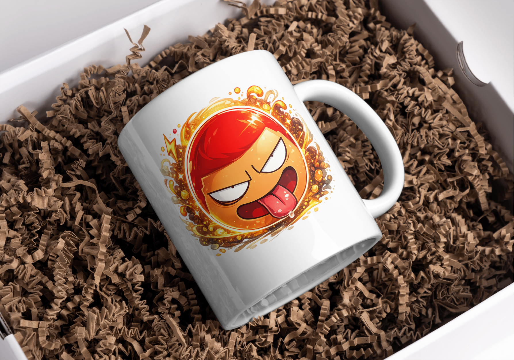A playful ceramic coffee mug featuring a mischievous anime-style emoji bursting with fiery energy.