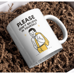 For the people allergic to inspirational posters: this one’s for you. The “Please Don’t Believe In Yourself” mug pairs a suited character with deadpan anti-motivation, making it the perfect counterbalance to relentless “hustle” noise.