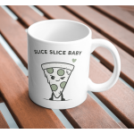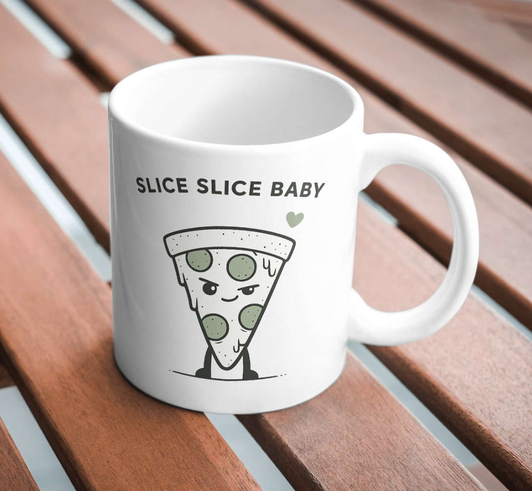 “Slice Slice Baby” features a confident cartoon pizza slice with playful swagger. Perfect for food lovers who enjoy humor with their caffeine fix.