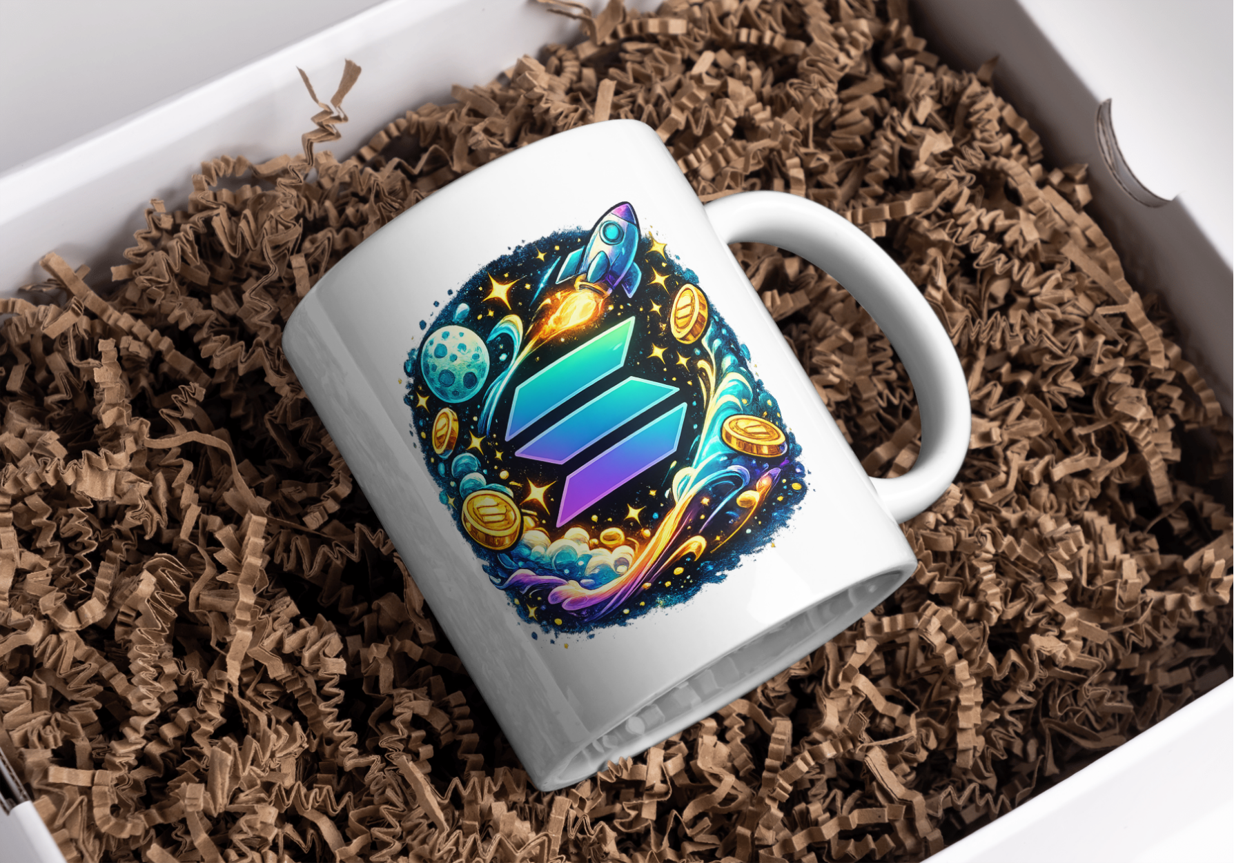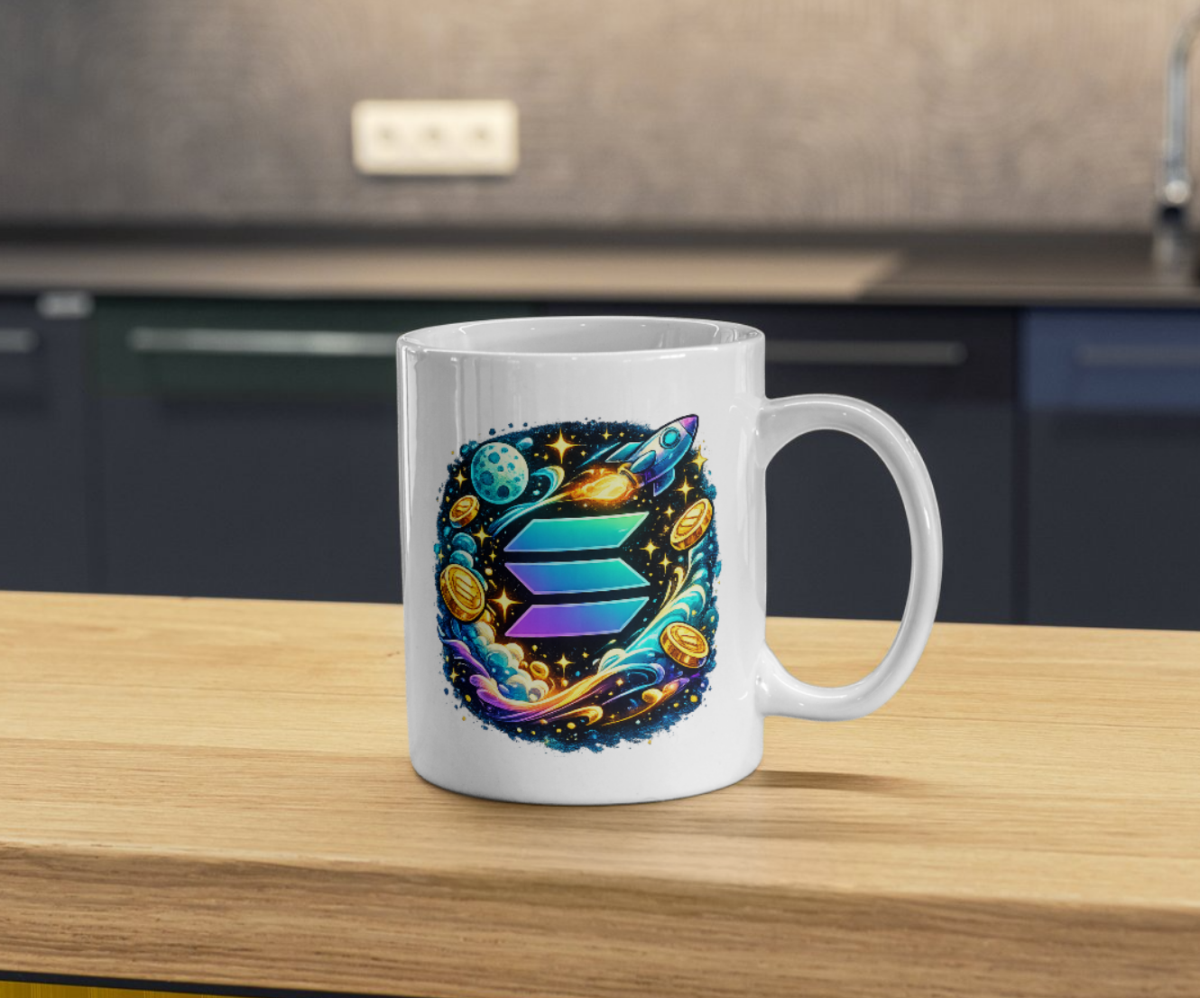 Inspired by Solana’s fast-moving ecosystem, this mug showcases a rocket-powered ascent through a cosmic crypto scene. Built for builders and believers in high-performance blockchains.
