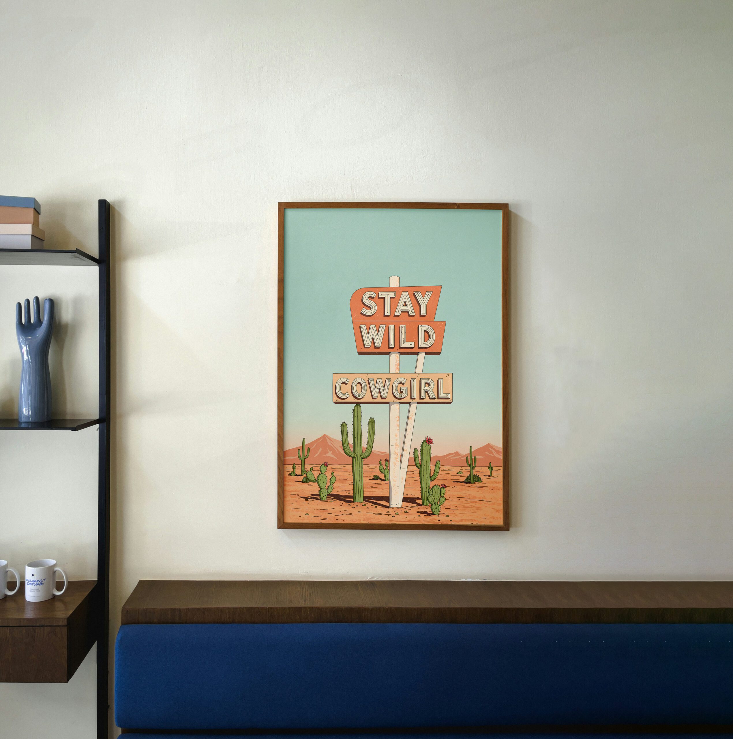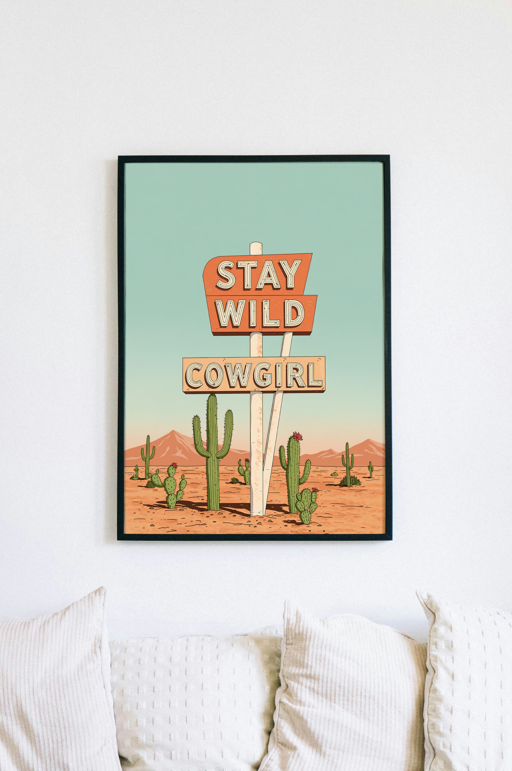 This Stay Wild Cowgirl wall art print features a bold roadside-style sign planted in an open desert landscape, surrounded by cacti, warm sand, and endless sky. It’s simple, confident, and unapologetically free-spirited.