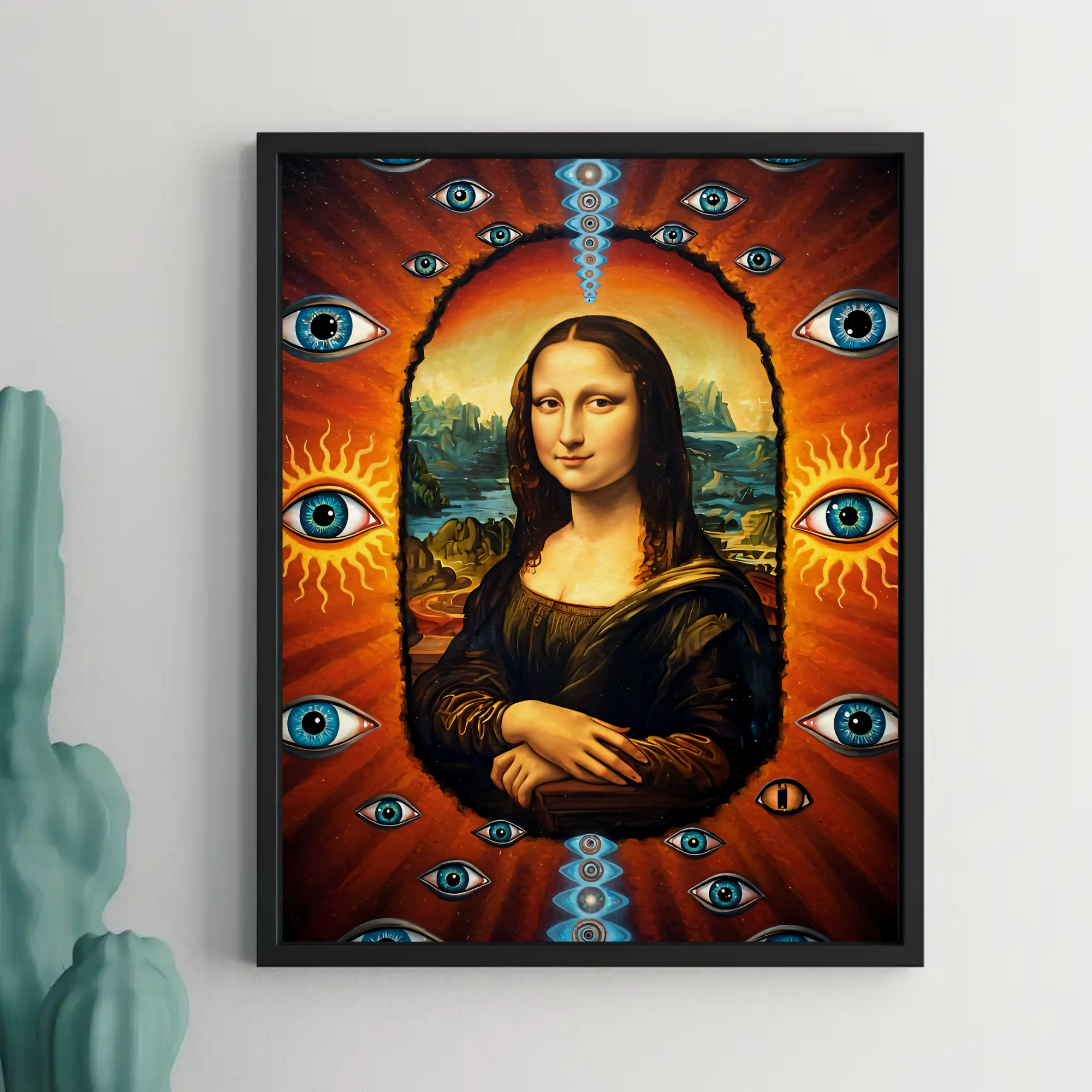 Trippy Mona Lisa Wall Art Print | Psychedelic Eye & Sun Symbolism | Surreal Cosmic Renaissance Artwork | Mystical Statement Wall Decor
