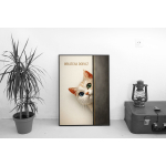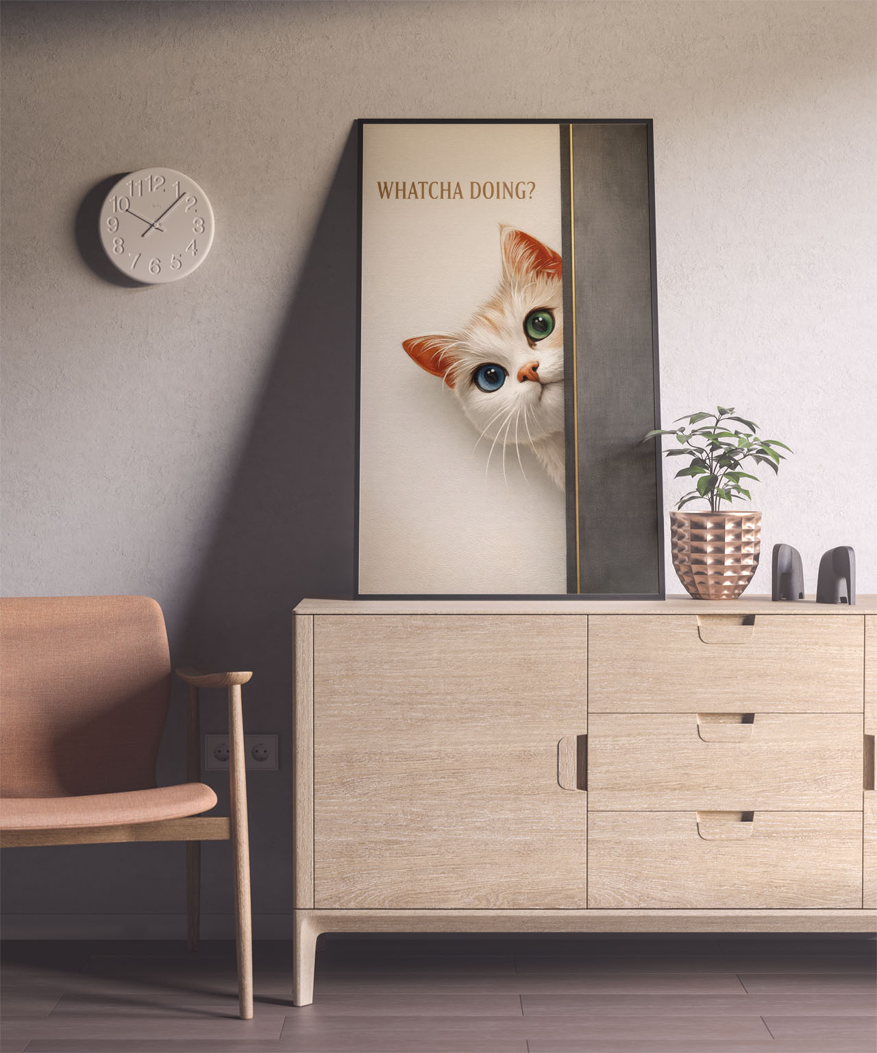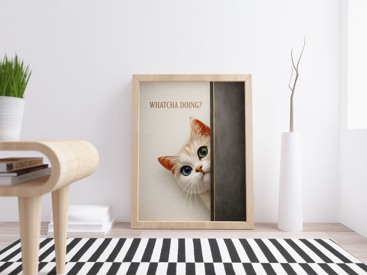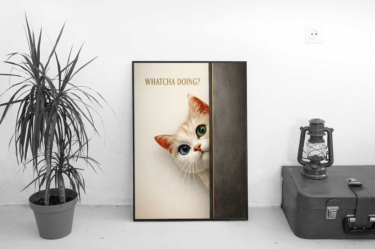 This charming cat wall art print captures a single, perfect moment of feline interruption. A wide-eyed cat peeks around the edge of a wall, frozen mid-question, paired with the understated phrase “Whatcha Doing?”. The result is playful without being childish, minimal without being cold.