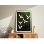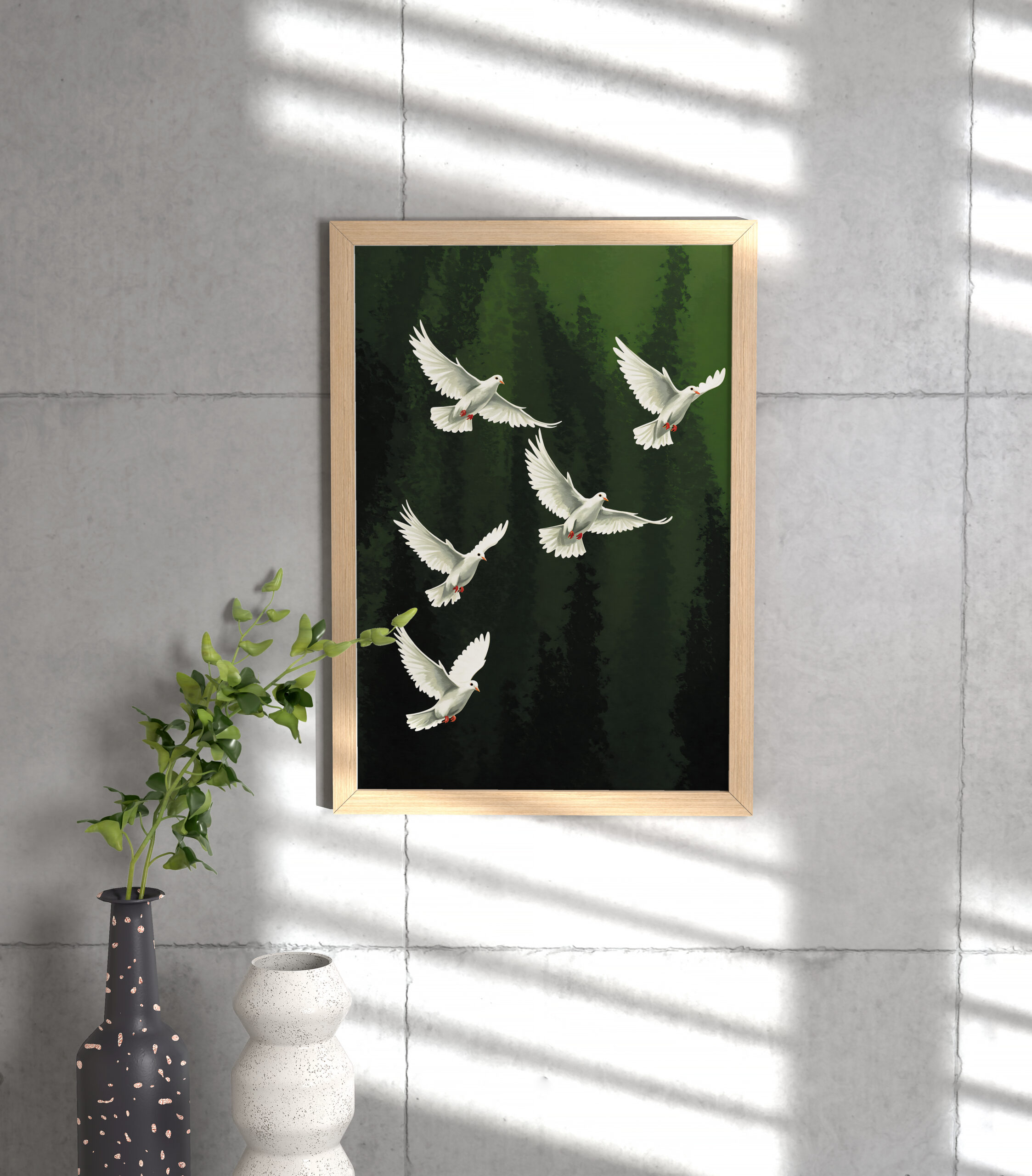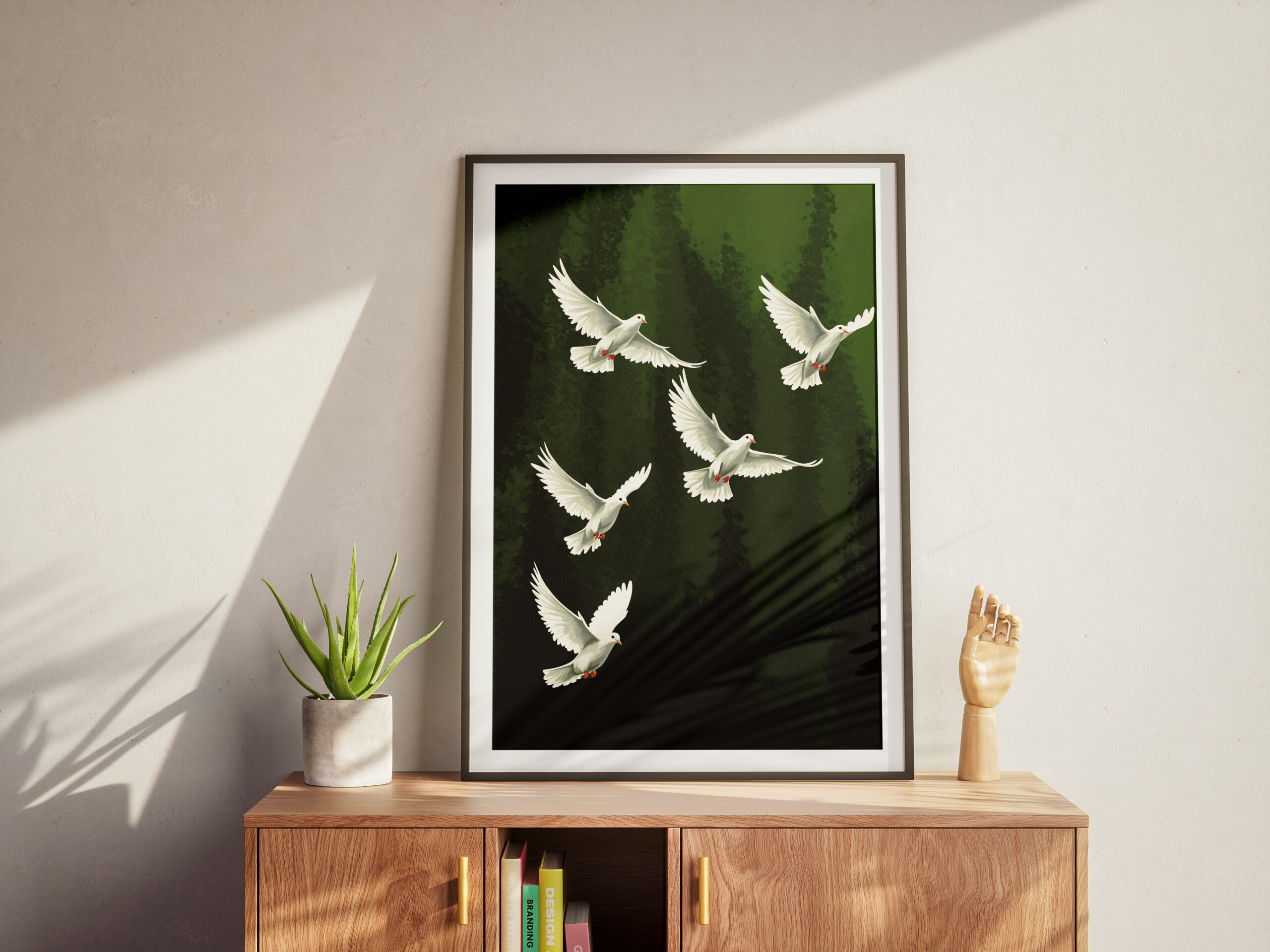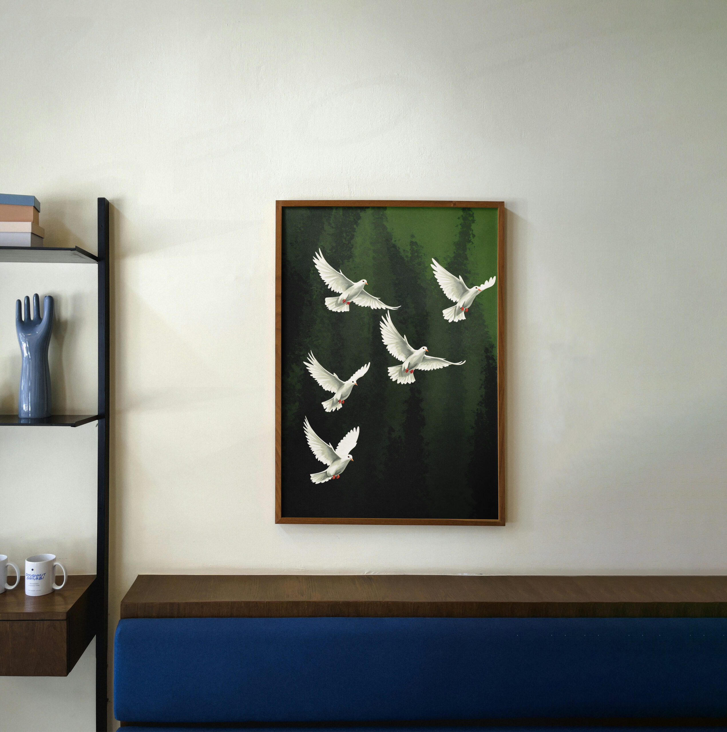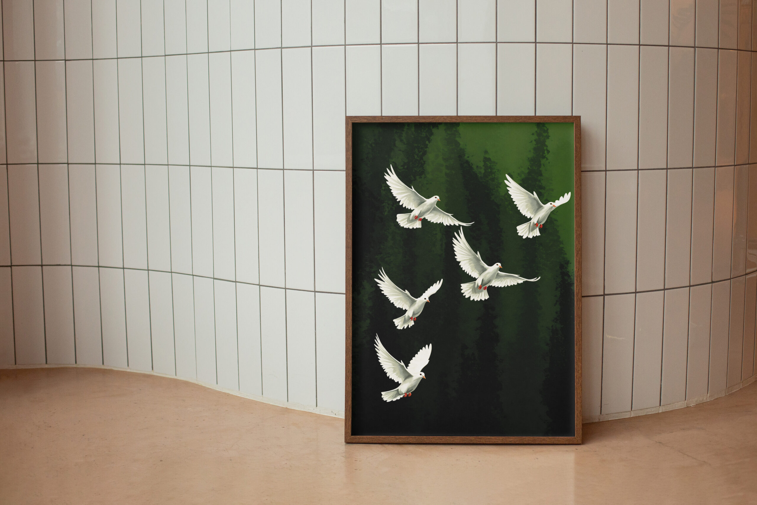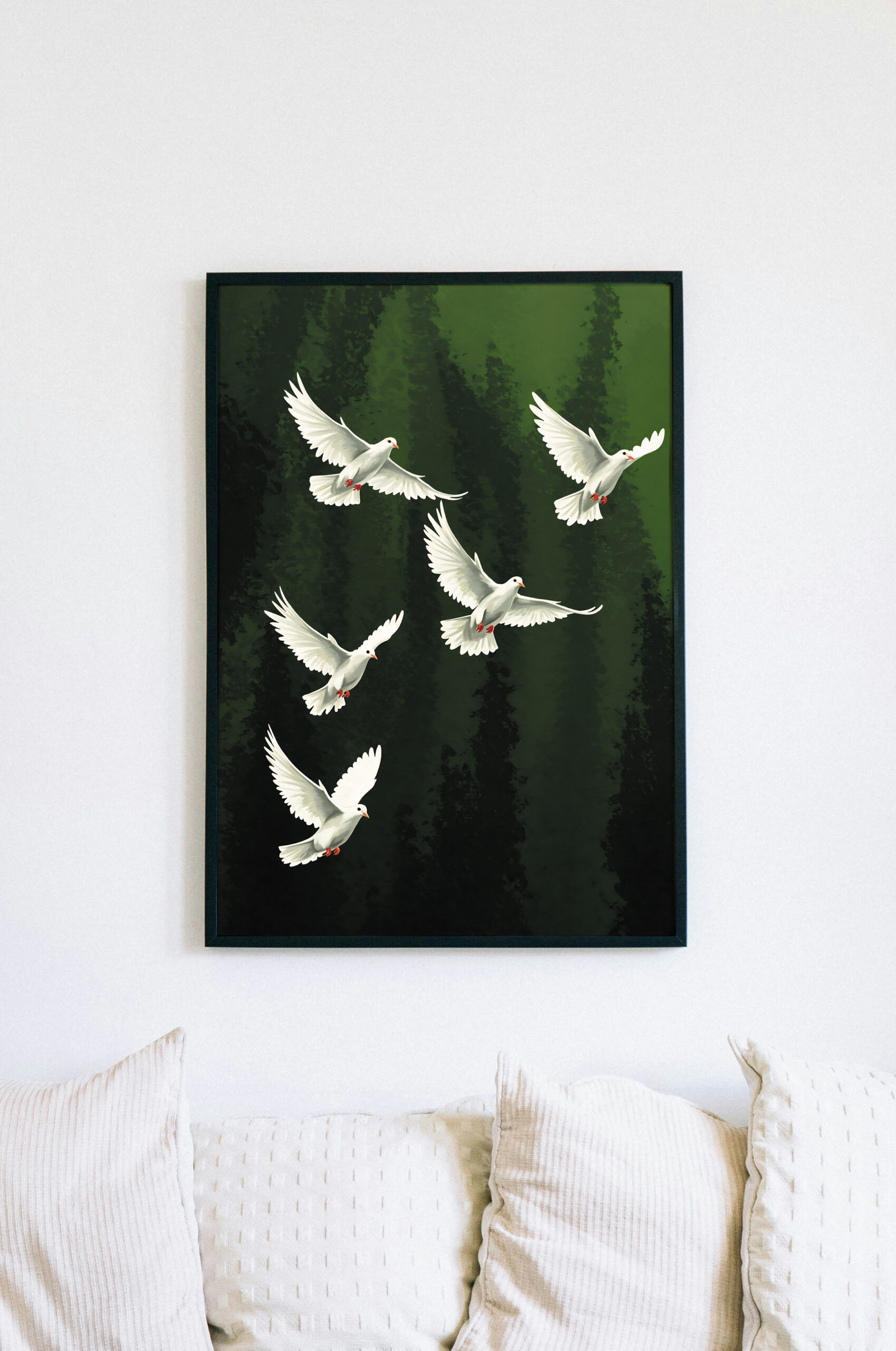 Elevate your home decor with this White Doves Wall Art, featuring five graceful doves soaring against a rich green backdrop. Symbolizing peace, hope, and freedom, this elegant printable artwork brings a serene and calming atmosphere to any space.