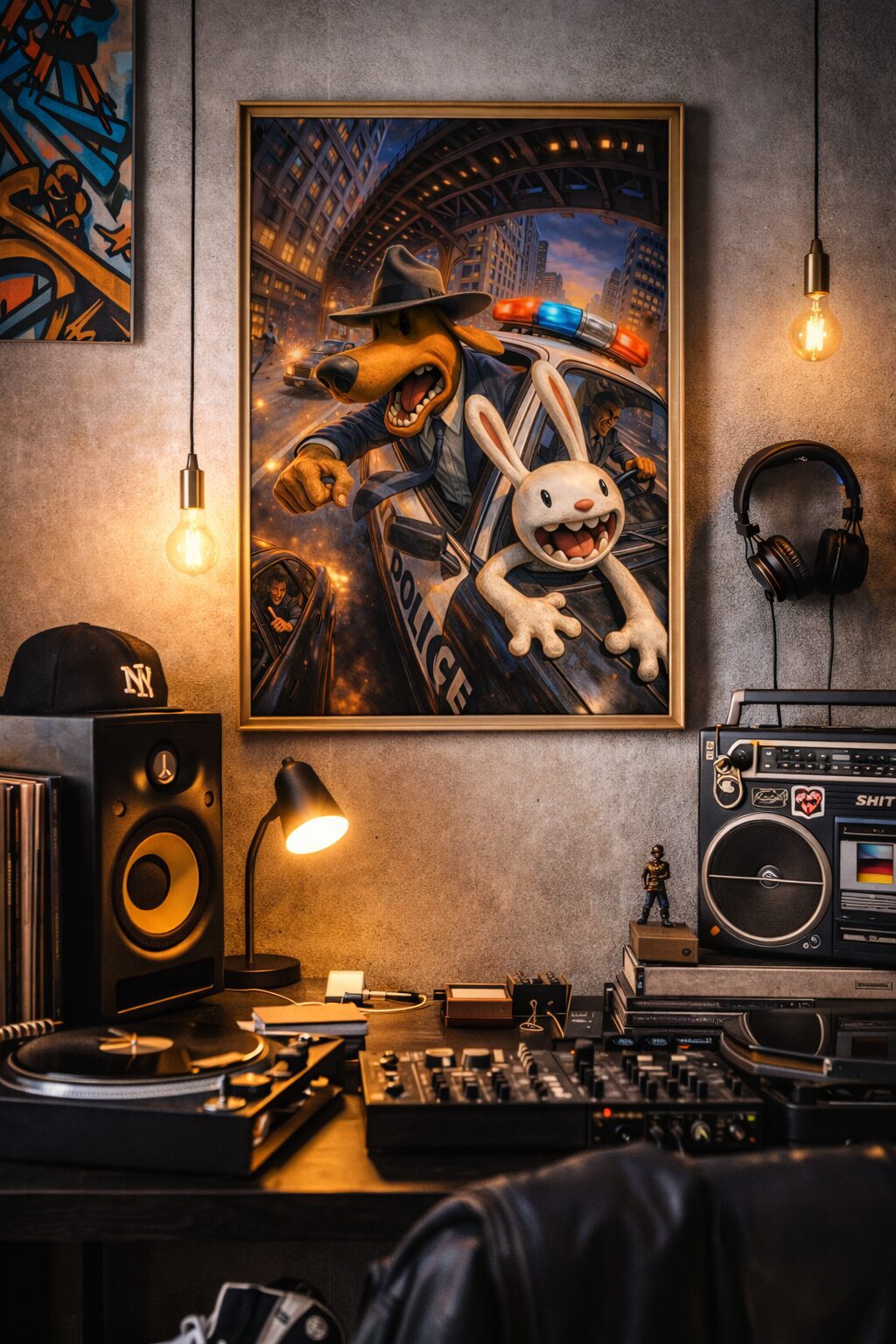 Pure adrenaline, zero restraint. This cinematic wall art captures a high-speed police chase spiraling through a glowing city at night, led by an unhinged duo: a trench-coat-wearing dog detective and a wide-eyed rabbit hanging out the squad car window like consequences are optional. Fire, motion blur, city lights, and raw momentum collide in a scene that feels ripped straight out of an animated action film.