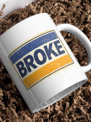 A clean minimalist mug featuring bold “Broke” typography in a retro blue and orange vintage stripe style.